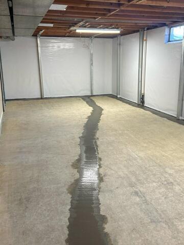 Our Foreman, Juan Pena, and his production crew began the project by jackhammering out the concrete floor perimeter, forming a trench. Inside the trench, our team installed our WaterGuard Below-Floor Drain, which prevents water and mud clogs, collects water seepage from basement walls, and has easily accessible service ports for check-ups. Next, our team installed our CleanSpace Wall System Vapor Barrier around the basement wall perimeter. Our CleanSpace prevents mold and humidity, saves money on energy costs, and covers any uneven surfaces. To complete the installation, our team filled the open faps with river rock and applied new concrete over them, ensuring the basement looked clean and tidy.