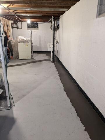 In a couple of weeks, our Design Specialist, Daniel R., arrived at the home to assess the basement. He informed the homeowner that one of the common causes of a damp basement is a failed footing drain. When this becomes clogged and fails, water saturates the soil surrounding the foundation. Water then enters through cracks in the wall, between the footing and the wall, or under the footing. During Daniel's inspection, he noticed that the current sump pump was out of date and kept it in mind when he designed a proposal for the homeowner. Daniel recommended our WaterGuard, a below-the-floor perimeter drain system that effectively collects water at the perimeter of the basement and sends it away, CleanSpace, a vapor wall barrier that stops water vapor from permeating the walls, IceGuard, our discharge line system that will not freeze unlike traditional discharge lines, and Zoeller M53 pump that is capable of removing 2,220 gallons of water per hour. After reviewing Daniel's proposal, the homeowner happily agreed to move forward with the project.